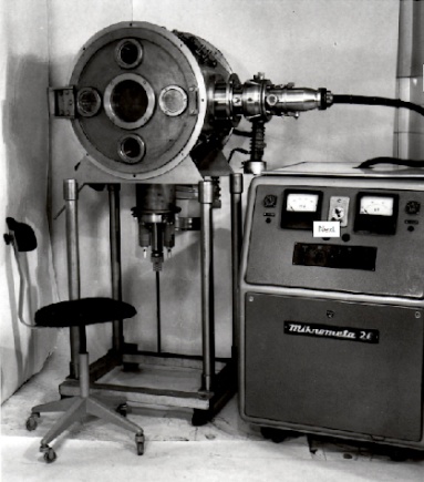 Významným míľnikom v oblasti spracovania materiálov elektrónovým lúčom je rok 1952, kedy fyzik Dr.h.c. Karl-Heinz Steigerwald skonštruoval prvé zariadenie na spracovanie materiálov elektrónovým lúčom (obr. 9.1) [1]. Pri urýchľovacom napätí 120 kV úspešne realizoval zváranie oceľových plechov hrúbok 1-2 mm.