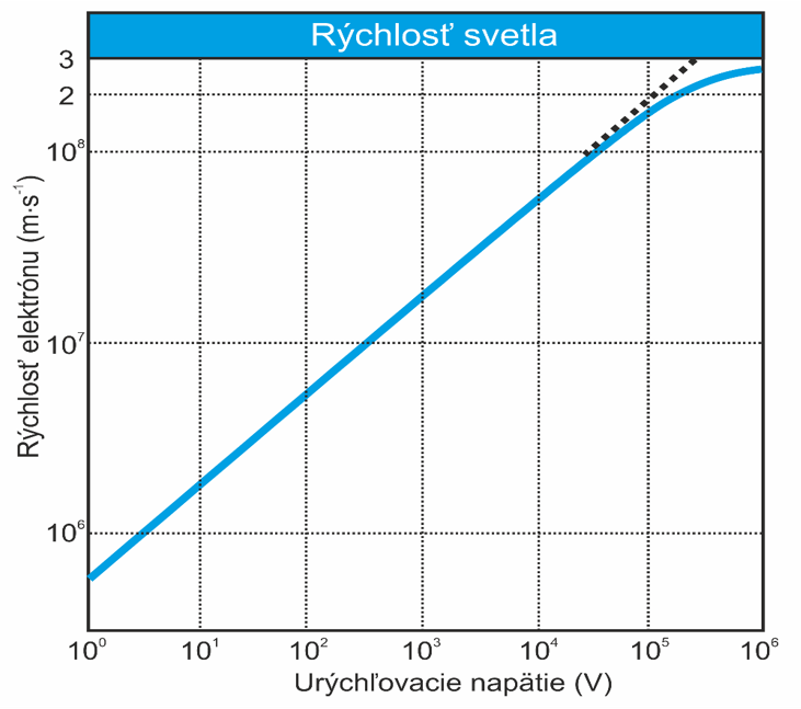 Obr. 9.4 Závislosť rýchlosti elektrónu od urýchľovacieho napätia [3]