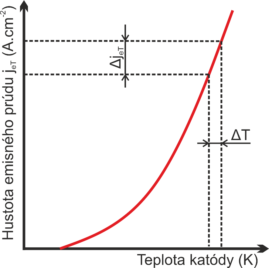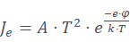 kde Je je hustota emisného prúdu [A·cm-2], A je konštanta emisie, ktorá závisí od materiálu termokatódy [40 až 70 A·cm-2·K-2], T je absolútna teplota katódy [K], e je základ prirodzených logaritmov, e∙φ  je výstupná práca elektrónov z kovu a k je Boltzmannova konštanta [1,38∙10-23J·K-1] [6].
