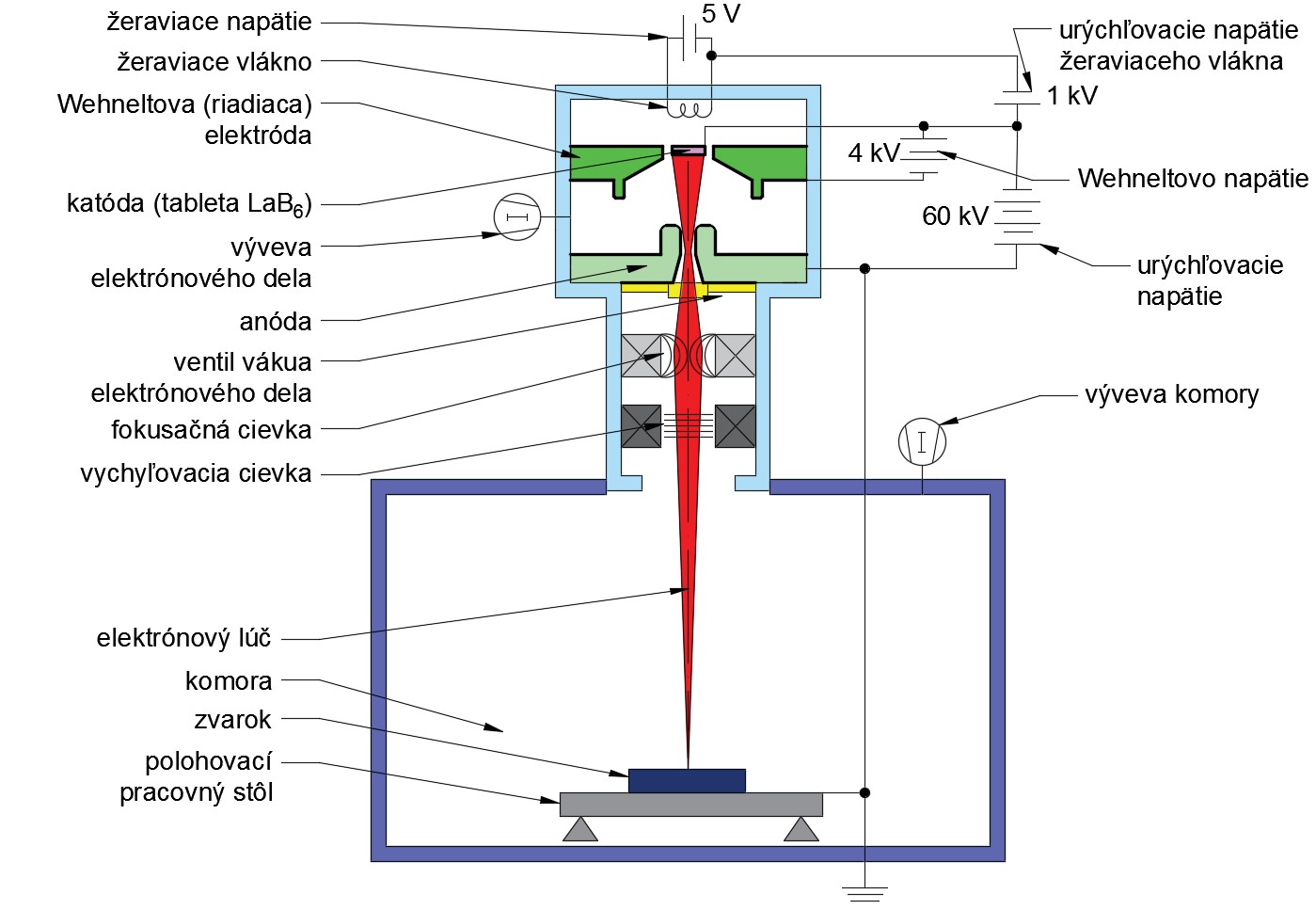 Princíp technológie zvárania elektrónovým lúčom je nasledovný. Najskôr sa z vákuovej komory odčerpá vzduch. Elektrónový lúč sa vytvára pri vysokom vákuu v elektrónovom dele. Žeraviacim prúdom sa generujú elektróny, ktoré sú urýchlené na termoemisnú katódu (tabletu LaB6). Po ich dopade na povrch katódy jej elektróny odovzdajú svoju kinetickú energiu, katóda sa zohreje a emituje elektróny. Ich množstvo, ktoré zodpovedá veľkosti zváracieho prúdu a vlastne množstvu generovaného tepla elektrónovým lúčom je riadené napätím na Welnehltovej elektróde. Čím je napätie na nej menšie, tým viac elektrónov opúšťa katódu. Urýchlenie elektrónov nastáva medzi katódou a anódou s rozdielom potenciálov 60 až 175 kV, čím sa dosiahne ich urýchlenie  na približne 2/3 rýchlosti svetla.  Pomocou  magnetických  šošoviek sú elektróny následne  zaostrené  (sfokusované)  na zvárané materiály  ako lúč s vysokou hustotou výkonu. Po jeho dopade na zvárané materiály sa elektróny spomalia a ich obrovská kinetická  energia sa premení na teplo. Vedľajším produktom interakcie elektrónového lúča so zváranými materiálmi je vznik RTG žiarenia, ktoré je pohltené materiálom zváracej komory. Intenzity energie viac ako 1 kW/mm² vedú k samovoľnému  odparovaniu  materiálu  so  zodpovedajúcim  efektom  hlbokého  prievaru (keyhole).  Napr. generátory  firmy Steigerwald Strahltechnik  môžu dosahovať hustoty výkonu viac  ako  100  kW/mm²  a  otvárajú  tak  široké  spektrum  aplikácií  v  technológii  spracovania materiálov elektrónovým lúčom [1]. Pohybom zváraných materiálov pri dopadajúcom lúči na ich povrch sa vytvorí zvar. Po zvarení sa komora zavzdušní a zvarok sa z nej vyberie von. Schéma zariadenia a zvárania elektrónovým lúčom je na obr. 9.6.