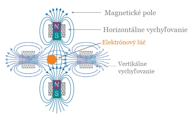 Aby bolo možné pracovať s elektrónovým lúčom, je potrebné nasmerovať ho na povrch zváraného materiálu. Elektrónový lúč je možné fokusovať pomocou magnetických polí. V prípade ak je drôt, ktorým prechádza elektrický prúd navinutý okolo elektrónového lúča, generuje táto cievka pole, ktoré slúži ako šošovka. Ohnisková vzdialenosť šošovky bude závisieť od energie elektrónu, prúdu cievky a tvaru cievky. Zmenou prúdu cievky je možné jednoducho meniť ohniskové vzdialenosti lúča. Umiestnením dvoch cievok kolmých na elektrónový lúč vzniká magnetické pole, prostredníctvom ktorého je možné zabezpečiť vychyľovanie elektrónového lúča bo bokov (obr. 9.8). Veľkosť takého vychýlenia bude opäť závisieť od prúdu cievky. Pridaním druhého páru cievok kolmých na prvú dvojicu je možné zabezpečiť vychyľovanie elektrónového lúča v ľubovoľnom smere po povrchu zváraných materiálov. Pripojením generátora funkcií je možné vytvárať na povrchu zváraných materiálov komplexné tvary [9].
