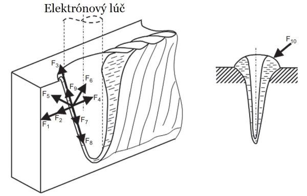 Menší podiel na vznik keyhole má priame vyparovanie kovu (cca 2 % objemu kanála) a tlak elektrónového lúča [23]. Fázy vzniku zvarového spoja vyhotoveného elektrónovým lúčom sú uvedené na obr. 9.12.