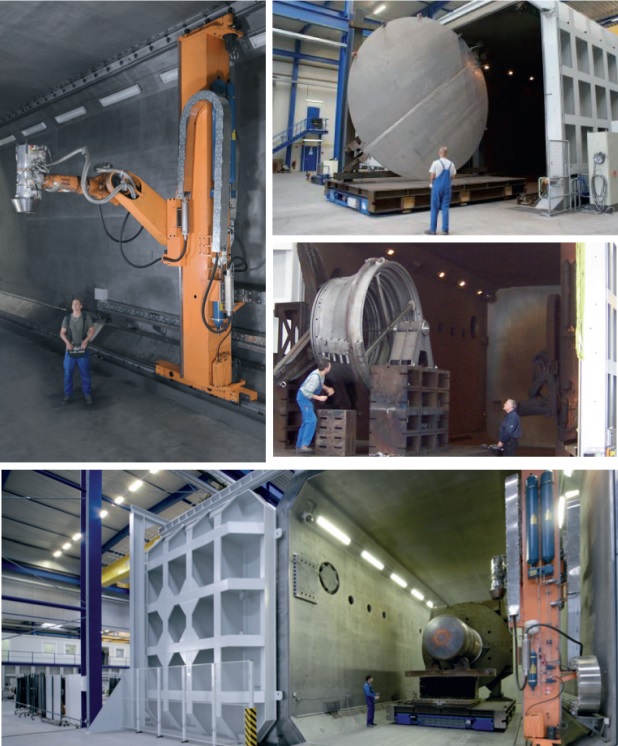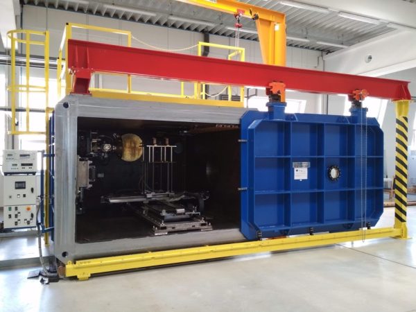 Obr. 9.17 Vákuová komora zariadenia K6000 (s objemom 630 m3) s generátorom elektrónového lúča vo vnútri komory upevnenom na robotickom ramene [9]
