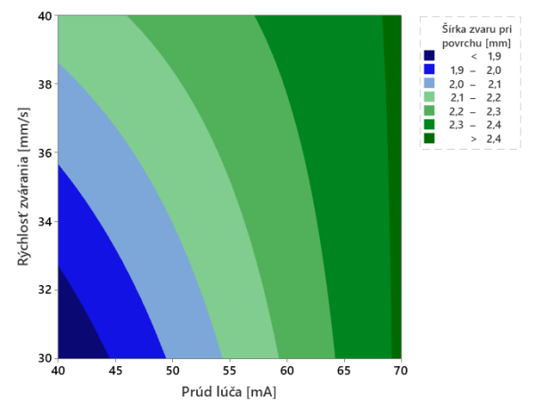Obr. 9.21 2D graf závislosti šírky zvaru pri povrchu od rýchlosti zvárania a prúdu lúča [29]