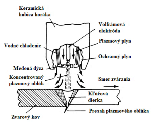 Zváranie plazmou (PAW – Plasma Arc Welding) je proces tavného oblúkového zvárania, pri ktorom oblúk horí medzi netaviacou sa volfrámovou elektródou a základným materiálom v inertnej atmosfére plynov (obr. 10.1). Na rozdiel od metódy TIG sa používa zváracia dýza malého priemeru, ktorá zvárací oblúk kolimuje a tak koncentruje tepelnú energiu na malú plochu zváraného materiálu. Plazma sa vytvára ionizáciou časti plazmového plynu. Vysoká koncentrácia tepla a vysoká teplota plazmy zaručuje hlboké natavenie základného materiálu s charakteristickým prierezom zvarového kovu v tvare vínového pohára (obr. 10.2).