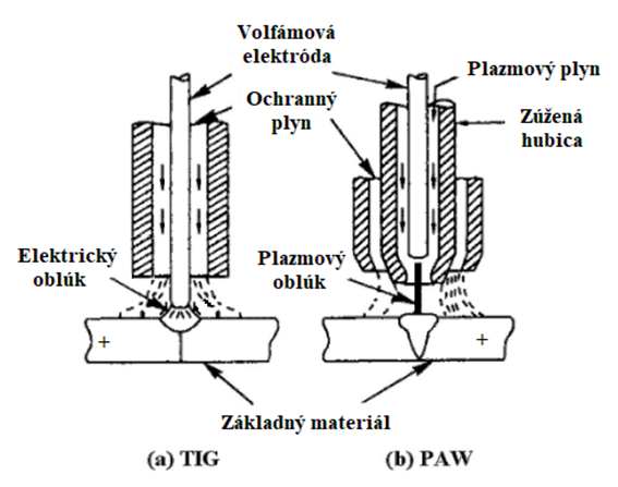 Obr. 10.2 Princíp zvárania metódou TIG a pomocou plazmového oblúka (PAW)[4]