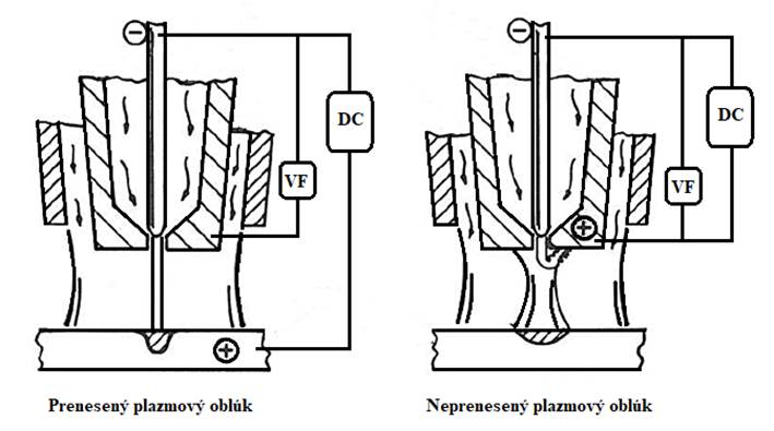 Plazmový oblúk môže horieť preneseným (závislým) resp. nepreneseným (nezávislým spôsobom), obr. 10.7. Pri zváraní elektricky vodivých materiálov sa používa zváranie s preneseným oblúkom. Neprenesený oblúk je možné použiť takisto pre zváranie elektricky vodivých materiálov, no primárne sa tento spôsob používa na tepelnom delení elektricky nevodivých materiálov.