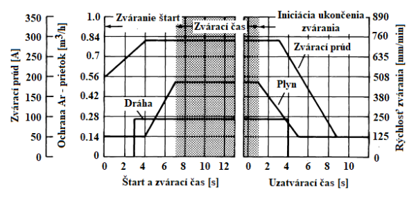 Obr. 10.8 Priebeh parametrov zvárania ocele hrúbky 9,5 mm technikou kľúčovej dierky [7]