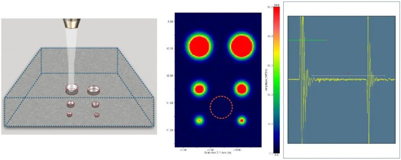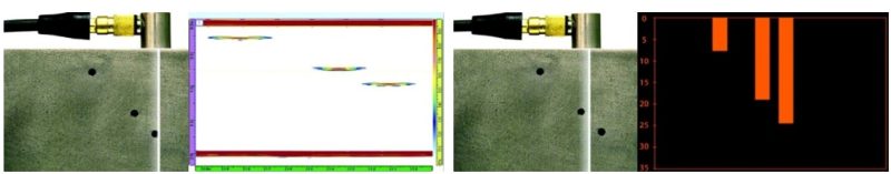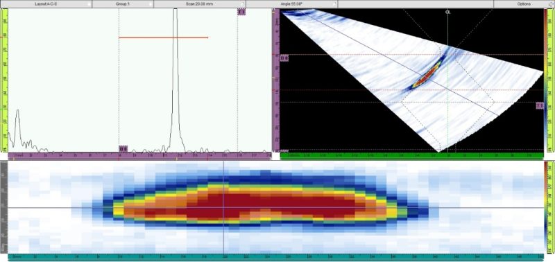 Obr. 4.36 Záznam z PA kontroly: A-sken, S-sken a C-sken [7]