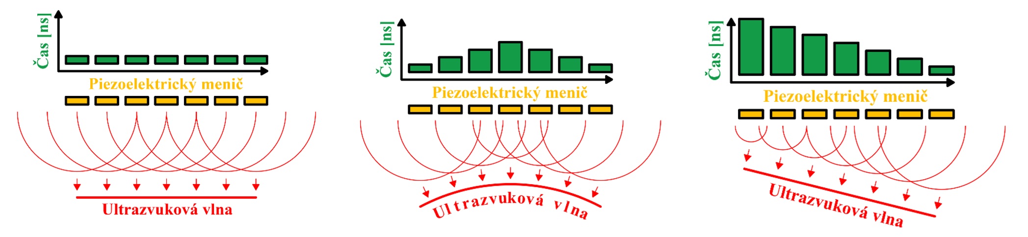 Princíp riadenia ultrazvukového zväzku pri technike PA je spínanie jednotlivých elementov sondy v nami definovanej časovej postupnosti na základe nadefinovaných softvérových algoritmov. Pomocou takéhoto typu spínania (napájania elementov elektrickým impulzom) dostávame sondu s variabilným lomom ultrazvukového zväzku v materiáli (obr. 4.34).