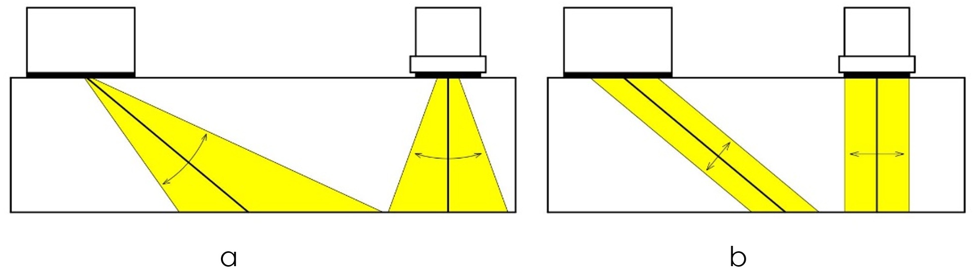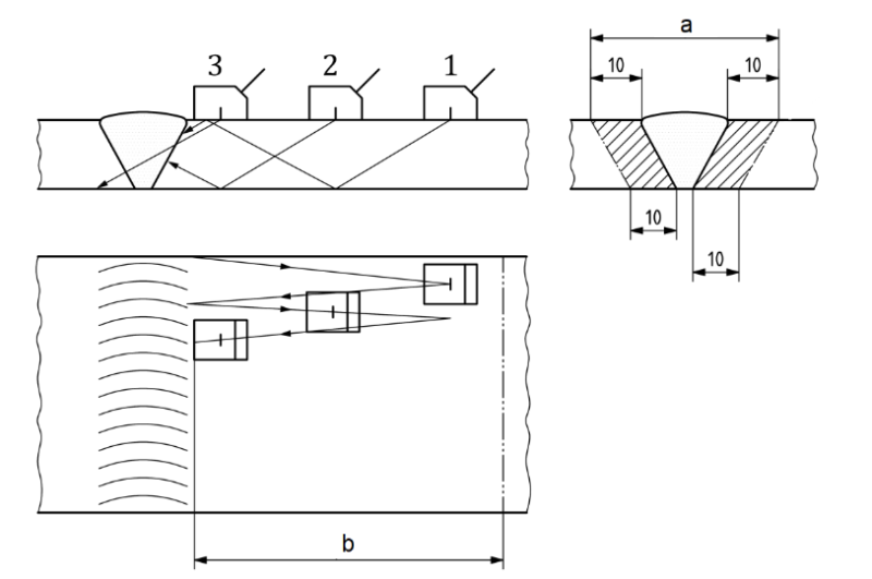 Pri kontrole zvarov uhlovými sondami je dôležité prezvučiť celý objem zvaru vrátane teplom ovplyvnenej oblasti v šírke minimálne 10 mm (obr. 4.32). Pri skúšaní sa sondou pohybuje k a od zvaru do vzdialenosti b, ktorá zaručí preskúšanie celého objemu. Stopy sondy sa musia pri pohybe k a od zvaru prekrývať. Skúša sa priamym a odrazeným lúčom, čo sa nazýva celý krok sondy. Voľba frekvencia a uhla lomu ultrazvuku v skúšanom materiáli závisí od skúšanej hrúbky a materiálu. Na skúšanie zvarov sa využívajú sondy s frekvenciami 2 – 5 MHz s uhlami lomu 45, 60 a 70°. Podmienky skúšky sú stanovené normami [12].
