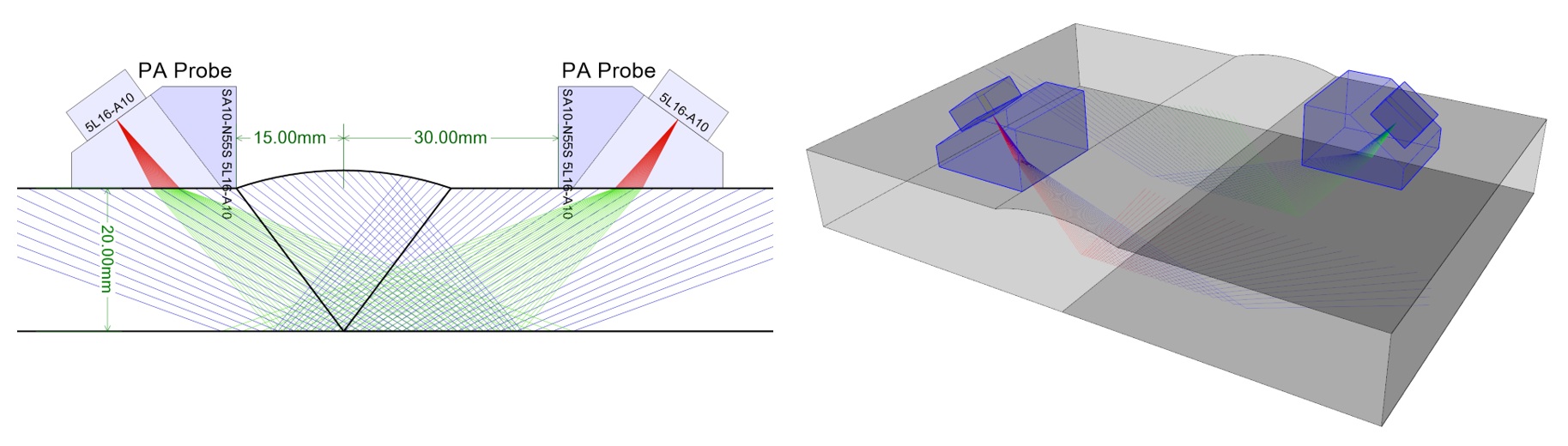 Pri kontrole zvarov technikou PA sa najčastejšie používa sektorový S-sken s uhlom sektora od 40 do 70°. Pred skúškou je dôležité stanoviť skúšobnú polohu sondy od osi zvaru. Skúšanie prebieha iba v jednej vzdialenosti sondy od osi zvaru, keď sa sondou pohybuje iba rovnobežne s osou zvaru. Základnou zásadou nastavenia správnej polohy sondy je, aby ultrazvukový lúč, vysielaný pod uhlom 60°, v materiáli smeroval do koreňa zvaru. Poloha sondy od osi zvaru teda závisí od skúšanej hrúbky. Na stanovenie polohy sondy je vhodné použiť geometrické znázornenie skúšaného zvaru a sondy. Pri skúške PA je potrebné prezvučiť celý objem zvarového spoja (obr. 4.37). V prípade neprezvučenia zvarového spoja z jednej polohy sa musí skúšať vo viacerých polohách. Pri kontrole technikou PA platia však rovnaké obmedzenia ako pri konvenčnej technike.