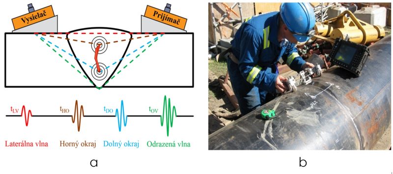 a – princíp techniky, b – meracia zostava TOFD [9]