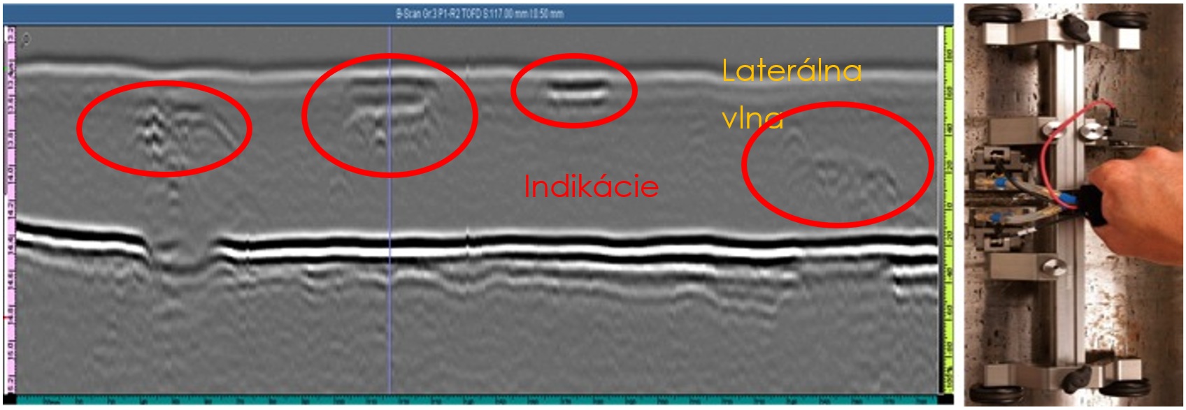 Pri väčšej hrúbke kontrolovaného materiálu takéto nastavenie vzdialenosti PCS nemusí postačovať, pretože nebude pokrytý celý objem zvarového spoja. Je potrebné zvážiť napr. rozloženie kontroly na viac krokov s rozdielnym nastavením vzdialenosti PCS, prípadne použitie viacerých párov sond TOFD súčasne tak, aby bol pokrytý čo najväčší objem zvarového spoja. Pri menšej hrúbke materiálu môže nastať opäť problém s väčšou šírkou zvaru, keď nebude možné dodržať predpísanú vzdialenosť PCS. V takých prípadoch treba zvážiť skenovanie popri hrane prevýšenia zvarového spoja aj výber plexisklových nadstavcov s vhodným uhlom lomu ultrazvukových vĺn. Na obr. 4.40 je zobrazený záznam z merania technikou TOFD [7, 9].