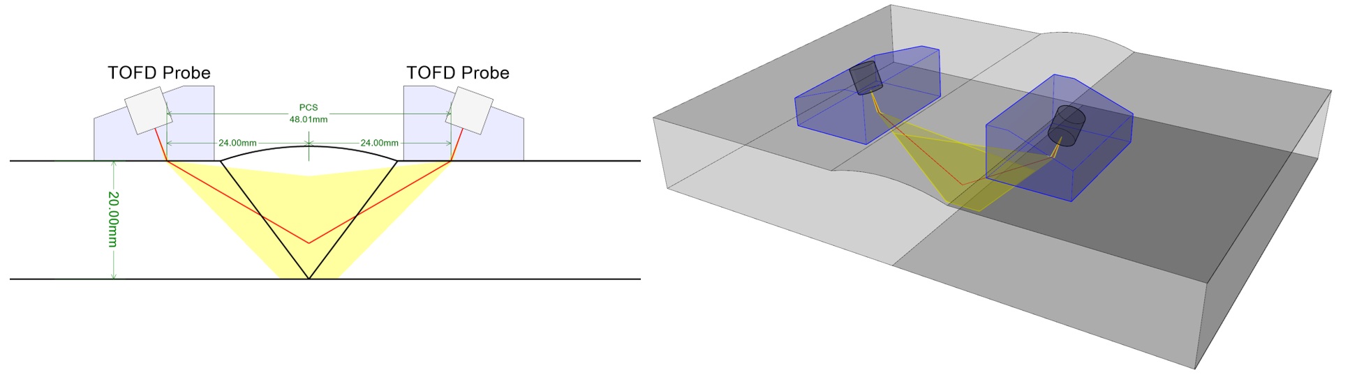 Pri ultrazvukovej defektoskopii TOFD treba brať do úvahy aj mŕtve zóny (ultrazvukom neprezvučené oblasti), ktoré vznikajú najmä pri väčšom priereze zvarového spoja v jeho prevýšení a v koreni. Veľkosť týchto mŕtvych zón závisí od frekvencie, nastavenia vzdialenosti PCS (Probe Center Separation), hrúbky kontrolovaného materiálu a uhla sond. Ultrazvukové sondy TOFD majú pomerne malý piezoelektrický menič, čo spôsobuje široké rozovretie zväzku ultrazvukového vlnenia, ktoré umožňuje prezvučenie veľkého objemu kontrolovaného materiálu. Frekvencia sond TOFD je zvyčajne 5 až 15 MHz s krátkym a silno tlmeným ultrazvukovým impulzom [14, 18].