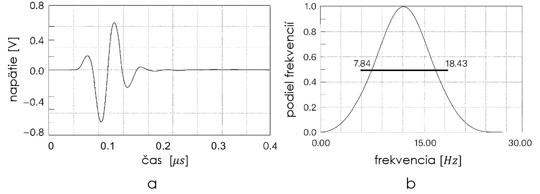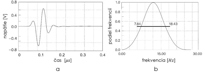 a – tvar a priebeh impulzu, b – frekvenčné spektrum [5]
