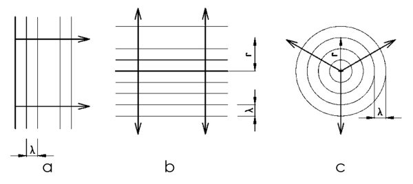 Ultrazvukové vlny vznikajú šírením mechanického kmitania medzi časticami prostredníctvom pružných väzbových síl. Ultrazvukové vlny môžeme rozdeliť podľa tvaru vlnoplochy alebo podľa spôsobu kmitania častíc okolo svojich rovnovážnych polôh. Všetky susediace častice kmitajúce v rovnakej fáze tvoria vlnoplochu. Podľa tvaru vlnoplochy rozdeľujeme ultrazvukové vlny na rovinné, valcové (cylindrické) a guľové (obr. 4.3).