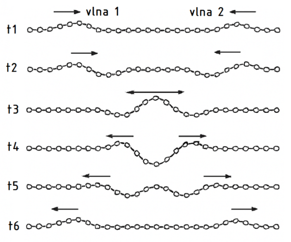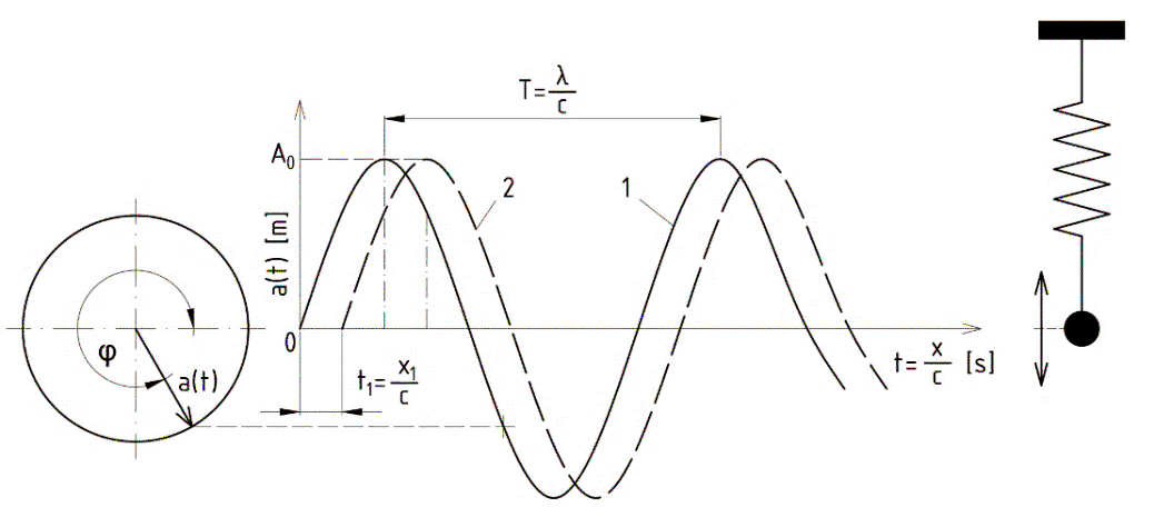 Ak pri harmonickom pohybe uvedieme jednu časticu z prostredia do pohybu, napr. v polohe x = 0 podľa vzťahu (1.1), prenesie sa vzruch za určitý čas  na susedné častice, ktoré sa postupne rozkmitajú. Stav pohybu častíc, tzv. fáza, závisí od polohy častice vzhľadom na referenčnú polohu v mieste x = 0 a od rýchlosti šírenia vlny (rozruchu) c v pružnom prostredí. Na obr. 5.1 je kmitanie dvoch častíc posunutých o fázu φ, a teda druhá častica kmitá s oneskorením t = x/ c. Pri harmonickom kmitaní sa okamžitá výchylka a(t) opakuje po čase nazývanom perióda kmitu: