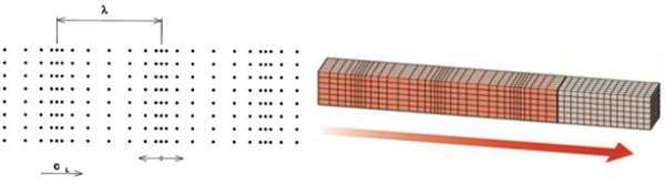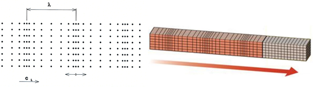 Pozdĺžne (L – longitudinálne) vlny  – pri pozdĺžnom vlnení (obr. 4.4) častice kmitajú po priamke v smere šírenia vlny. Pri tomto pohybe sa častice jednotlivých vlnoplôch k sebe približujú a následne vzďaľujú. Medzi vlnoplochami vzniká striedavo tlakové a ťahové napätie, pričom dochádza k lokálnym zmenám objemu prostredia. Pozdĺžne vlny sa vďaka svojmu fyzikálnemu princípu šírenia na základe ťahových a tlakových napätí môžu šíriť v plynnom, kvapalnom a j pevnom prostredí. Ide o najčastejšie používané ultrazvukové vlnenie. Jedinou podmienkou šírenia tejto vlny sú dostatočne veľké rozmery prostredia vzhľadom na vlnovú dĺžku λ. Rýchlosť pozdĺžnej vlny sa označuje ako cL [2].
