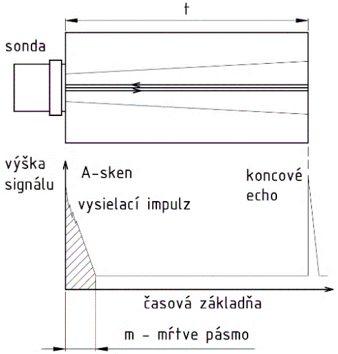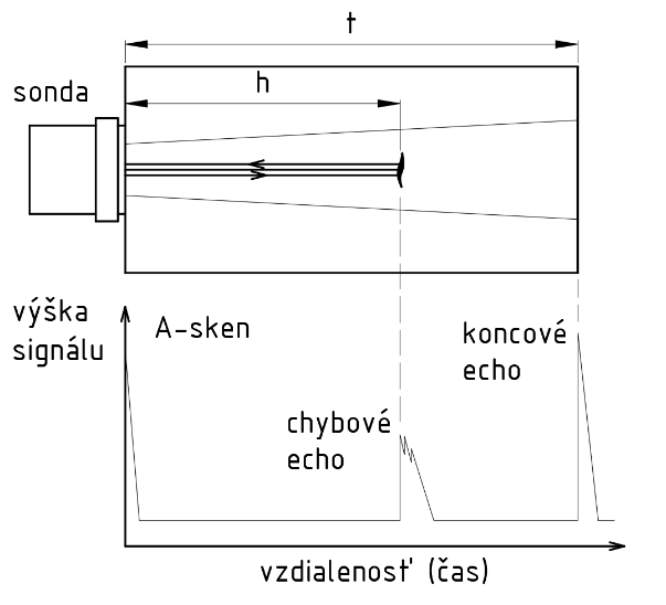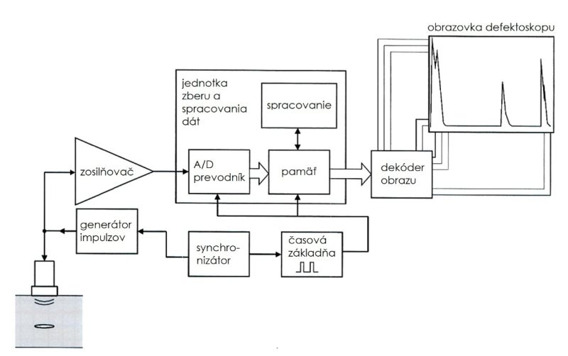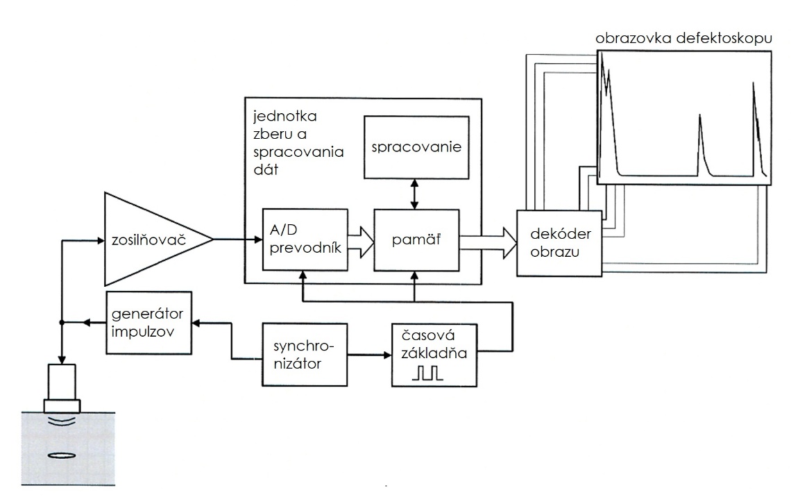 Z ultrazvukového defektoskopu sú na sondu privádzané krátke elektrické impulzy v nastavených časových intervaloch (vysielacia frekvencia), ktoré sonda premieňa na ultrazvukové vlny šíriace sa do materiálu. Hodnota elektrických impulzov býva od desiatok do stoviek voltov. Echá ktoré sa vracajú späť do sondy zo skúšaného materiálu pri odrazovej metóde alebo prechádzajú cez materiál do prijímača pri prechodovej metóde, sa v sonde transformujú z mechanickej vlny späť na elektrický impulz. Čím väčšia energia dopadne na menič, tým je hodnota elektrického impulzu vyššia. Echá vracajúce sa späť z materiálu majú však veľmi malú amplitúdu, preto je potrebné ich zosilniť v zosilňovači. Následne sú analógové signály cez analógovo-digitálny prevodník prevedené do digitálnej formy. Prevodník musí pracovať na vysokej frekvencii (100 MHz a viac), aby bol schopný previesť krátke impulzy v trvaní niekoľko ms. Ak sú signály takmer symetrické, tak je na obrazovke defektoskopu zobrazená iba polovica signálu, a to buď kladná, záporná alebo spriemerovaná. Aby bol nulový bod na obrazovke defektoskopu zhodný s nulovým bodom vyslania impulzu do materiálu, musí byť spustenie časovej základne a vyslanie impulzu časovo synchronizované. Na tento účel slúži synchronizátor. Základným zobrazením v ultrazvukovej defektoskopii je tzv. A-zobrazenie (A-sken). Je to zobrazenie, kde na vodorovnej osi je zobrazená dráha (čas) a na zvislej osi výška akustického signálu (obr. 4.25) [3].
