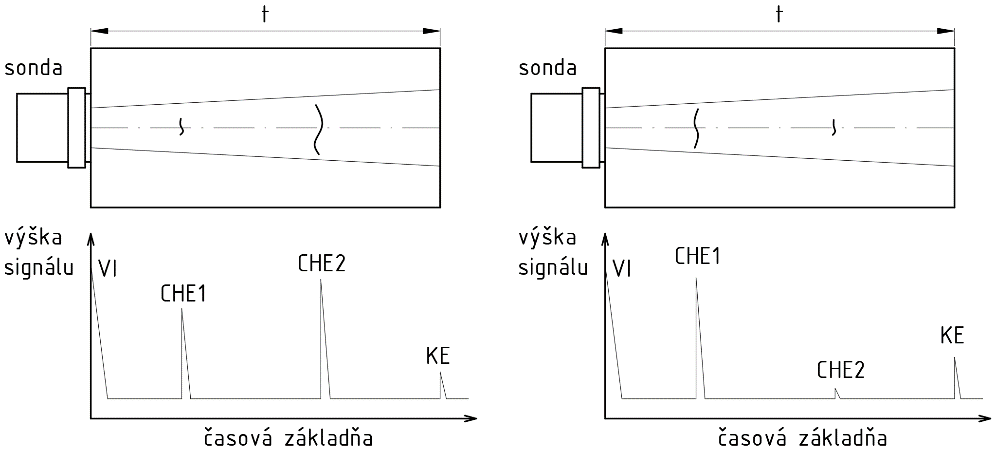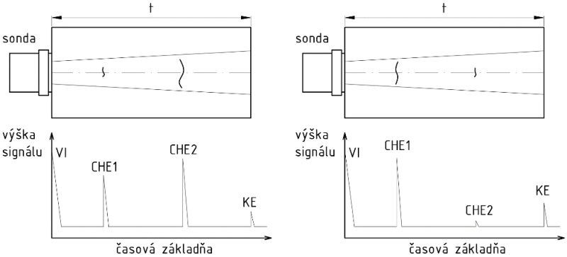 Na veľkosť echa má rozhodujúci vplyv vzdialenosť chyby od sondy, a to nielen pre útlm materiálu, ale aj pre divergenciu zväzku vo vzdialenom poli. Chyba nachádzajúca sa napr. na konci blízkeho poľa sondy sa môže prejaviť podstatne väčším echom ako iná, rozmerovo väčšia chyba, ktorá sa nachádza vo vzdialenom poli. Vplyv vlastností chyby je znázornený na obr. 4.30.