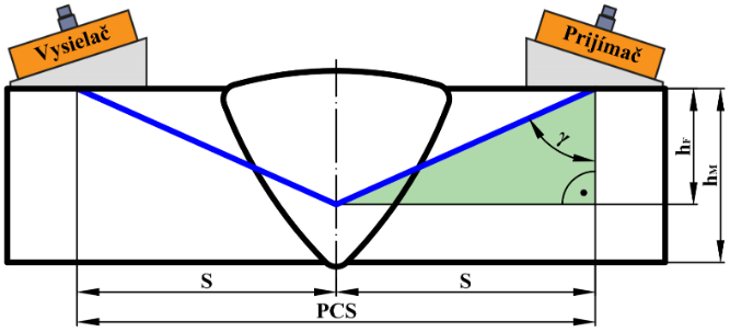 Obr. 4.32 Princíp kontroly tupých zvarov konvenčnou uhlovou sondou [12]