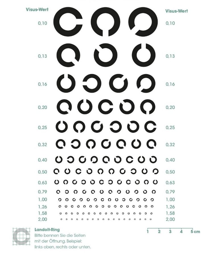 Ostrosť videnia na diaľku sa overuje pomocou Landoltových krúžkov (obr. 1.3) v tvare písmena „C“, čítaním zo vzdialenosti 4 až 6 m.