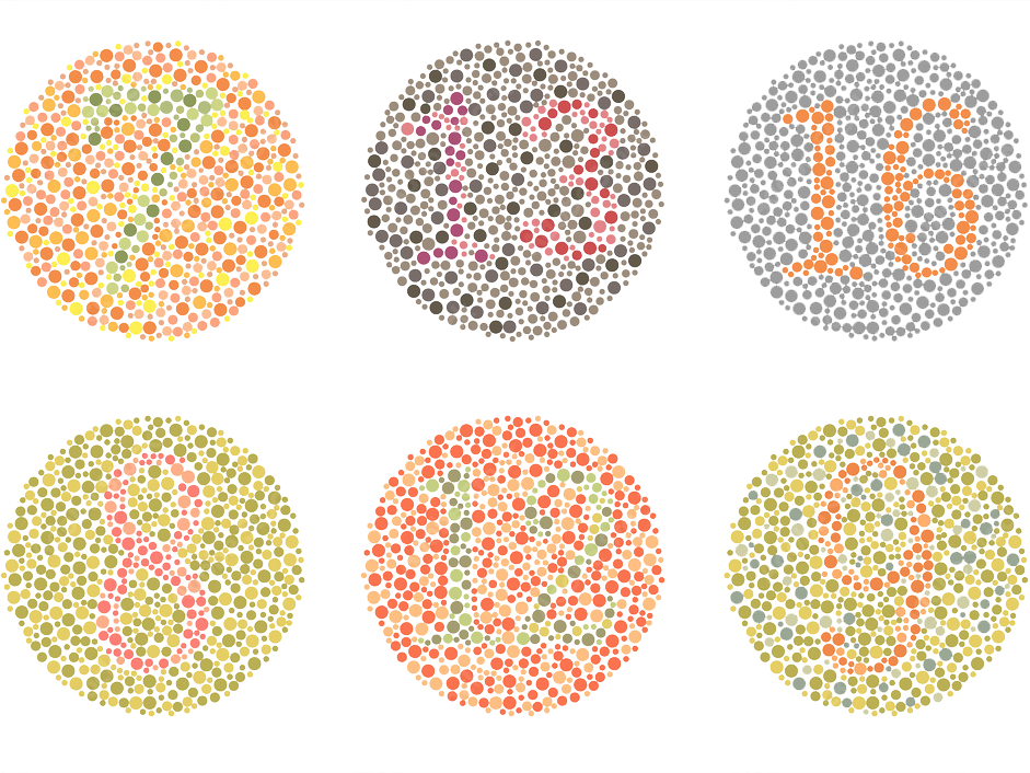 Farbocit sa kontroluje pre rôzne farby (spektrá viditeľného svetla). Existuje viacero testov na farbocit, pričom jedným z najznámejších je Ishiharov test (obr. 1.4), ktorý umožňuje stanoviť čiastočnú alebo celkovú poruchu farbocitu.