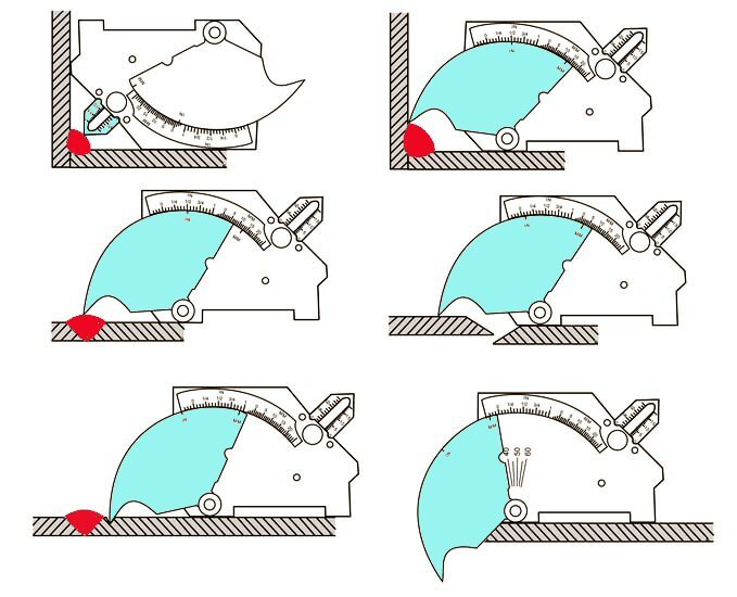 Mierky obsahujú niekoľko šablón (obr. 1.14), ktoré slúžia na meranie kútových zvarov. Pri meraní sa využíva princíp dotyku v troch bodoch. Na obr. 1.15 sú uvedené príklady, ako postupovať pri kontrole konkrétnych rozmerov [10].